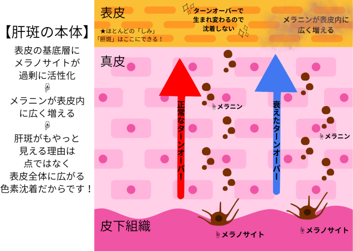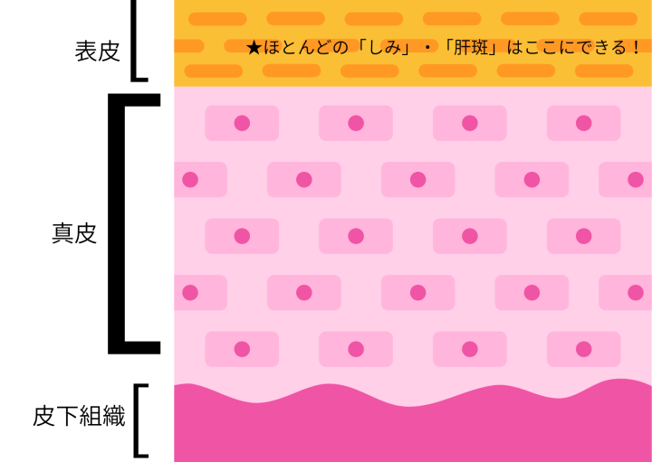 一般的なしみ(老人性色素斑)・「肝斑」どちらも【表皮】にできます!※一部、例外あり