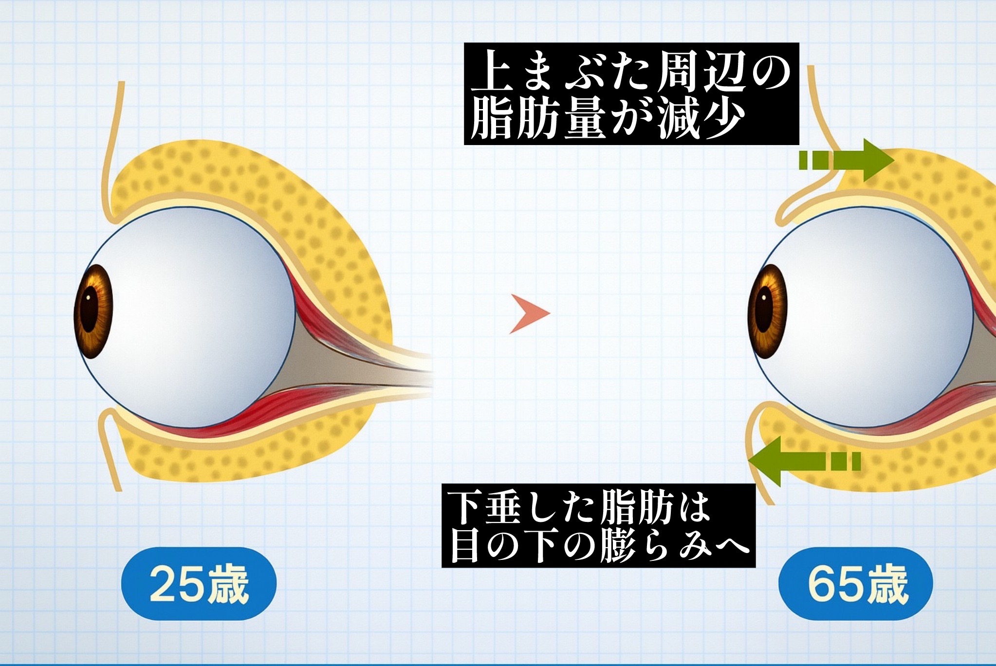 これらの脂肪が前に押し出されることで、「目の下のふくらみ」や「影クマ」ができるのです。