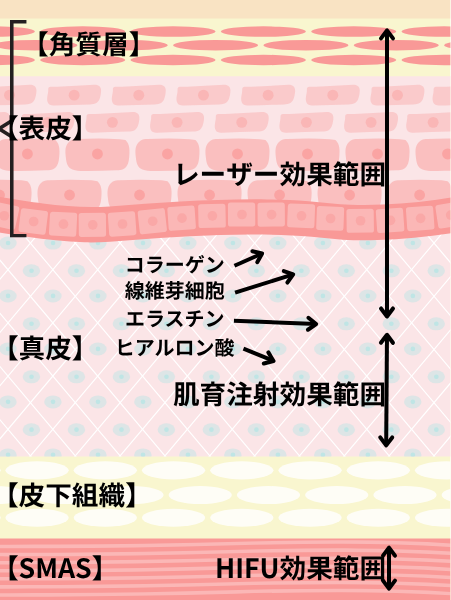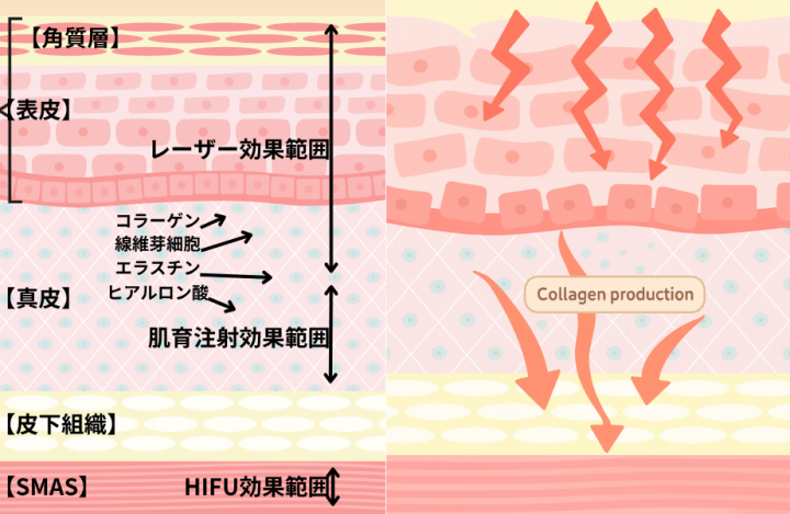 →レーザー➡表皮~真皮(浅層~中層)まで