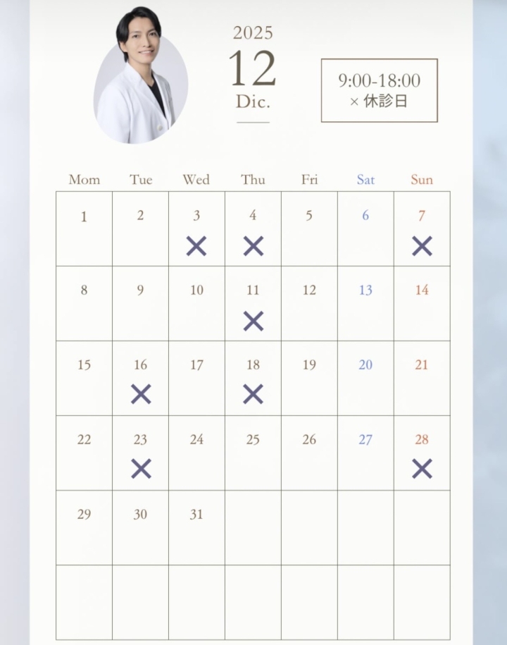 | 診療時間 | 9:00~18:00 最終受付:カウンセリングは16:30、施術は内容により異なります |
